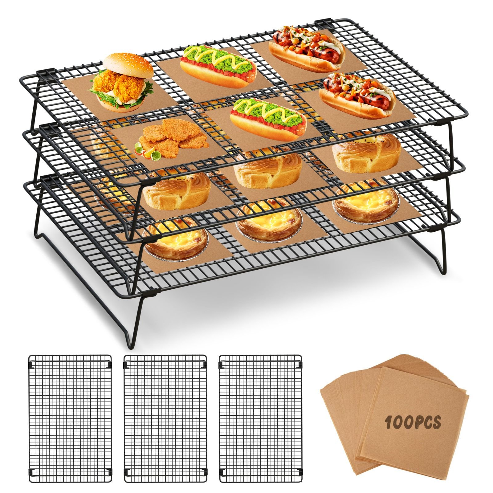 Home > 3-Tier Stackable Wire Cooling Rack Set Non-stick, ideal for cooling cookies, pizza, cakes, baking sheets (100 pieces), grilled meats