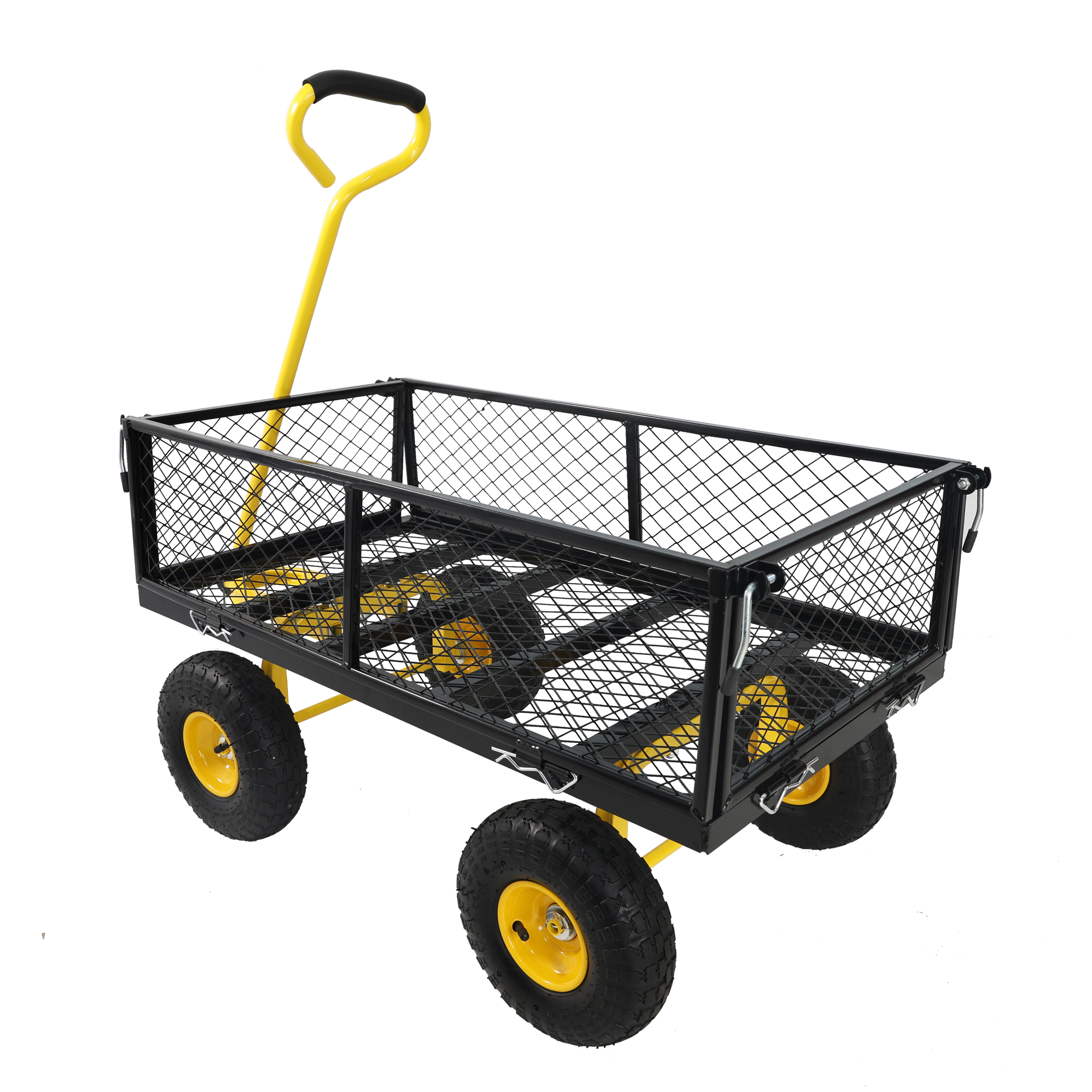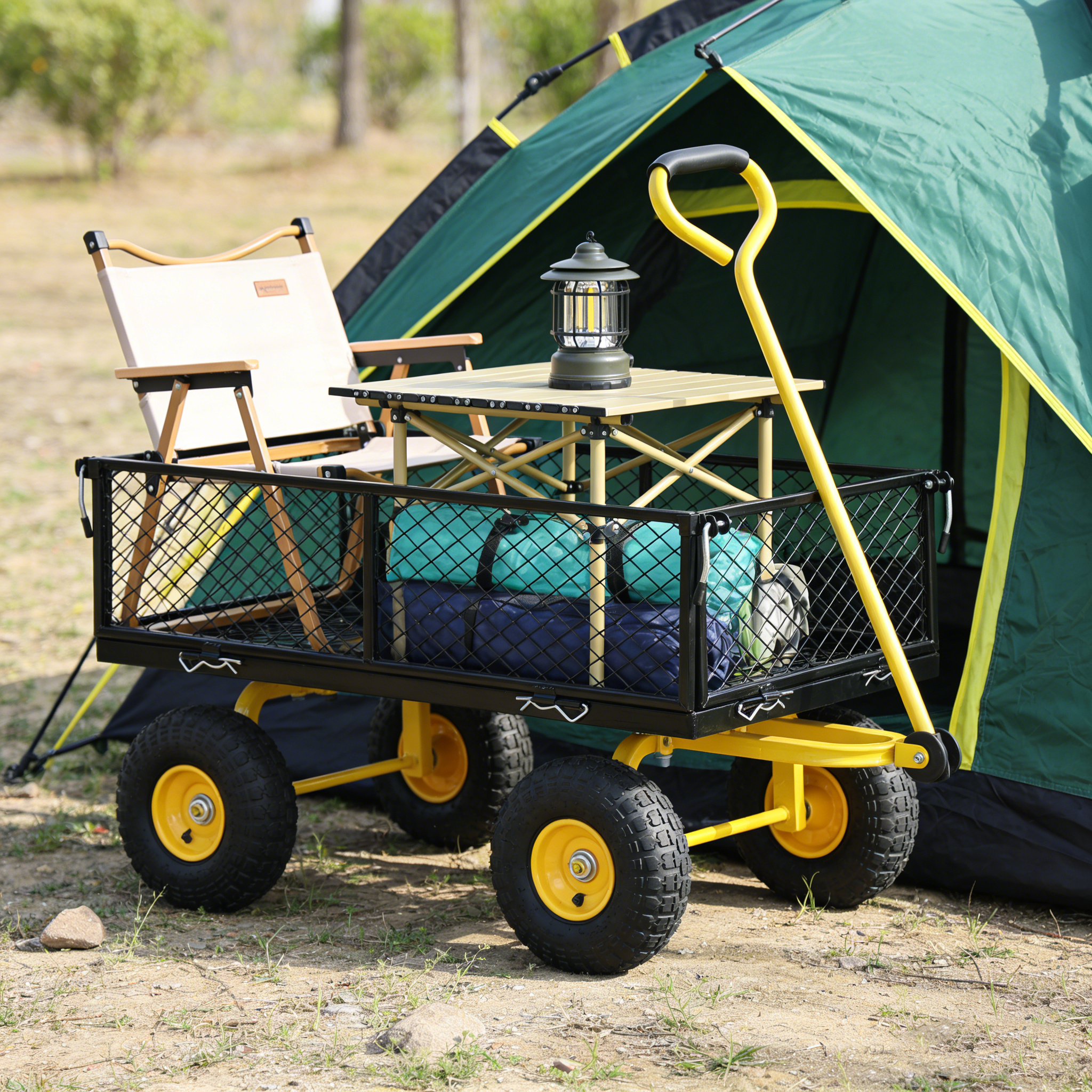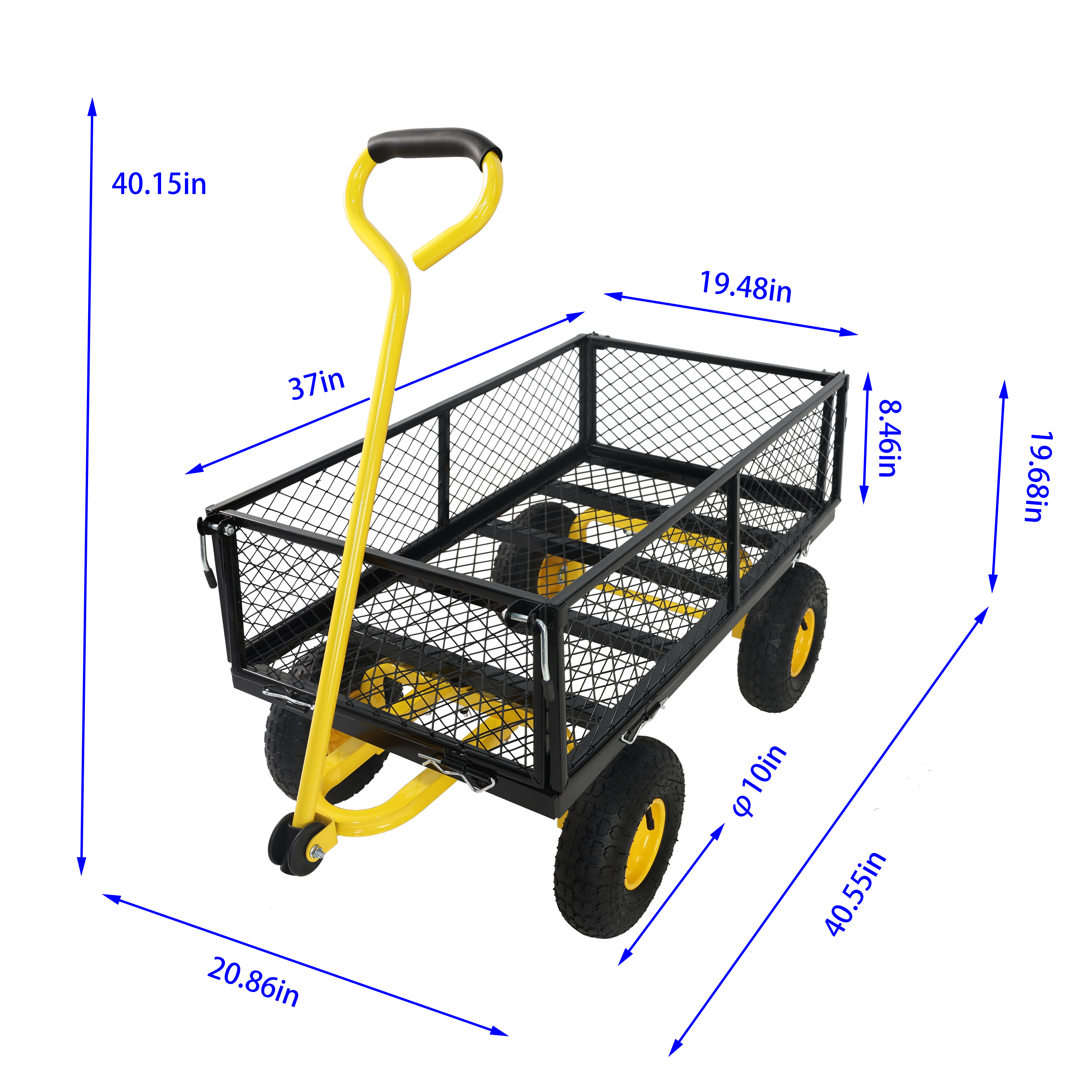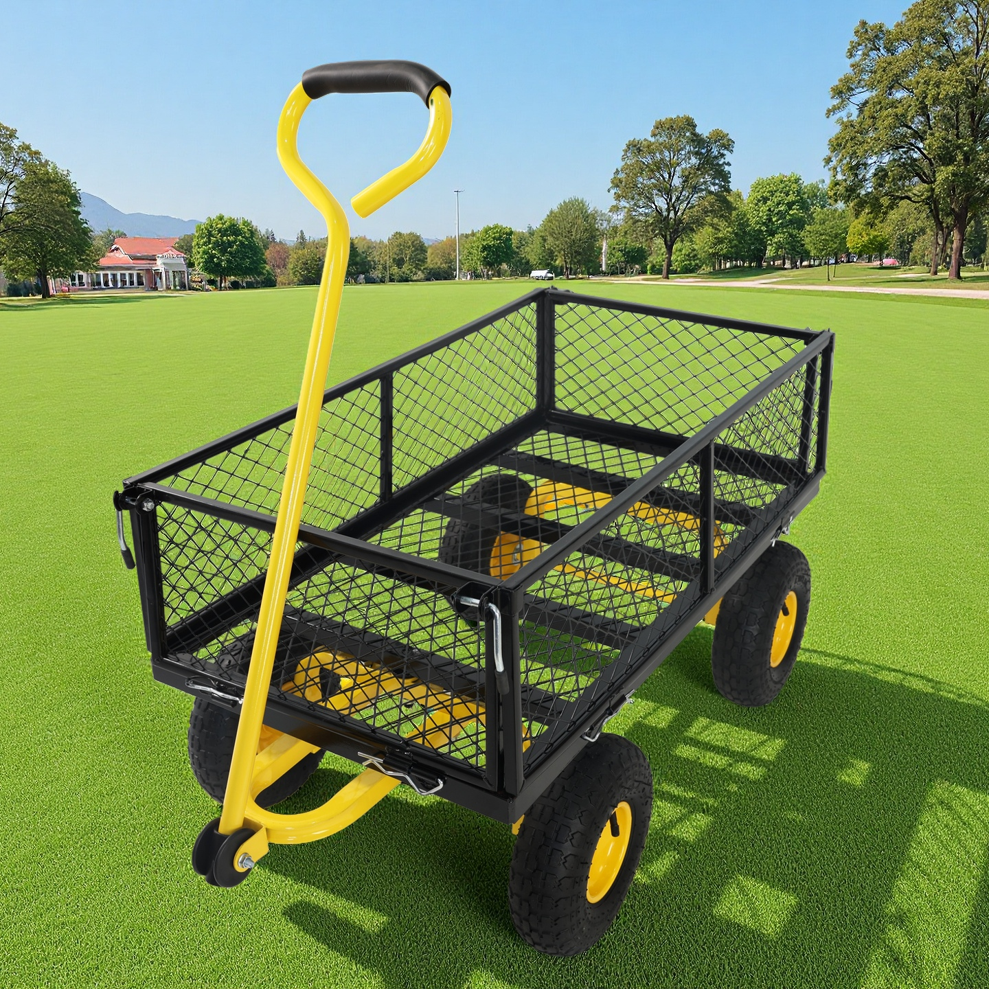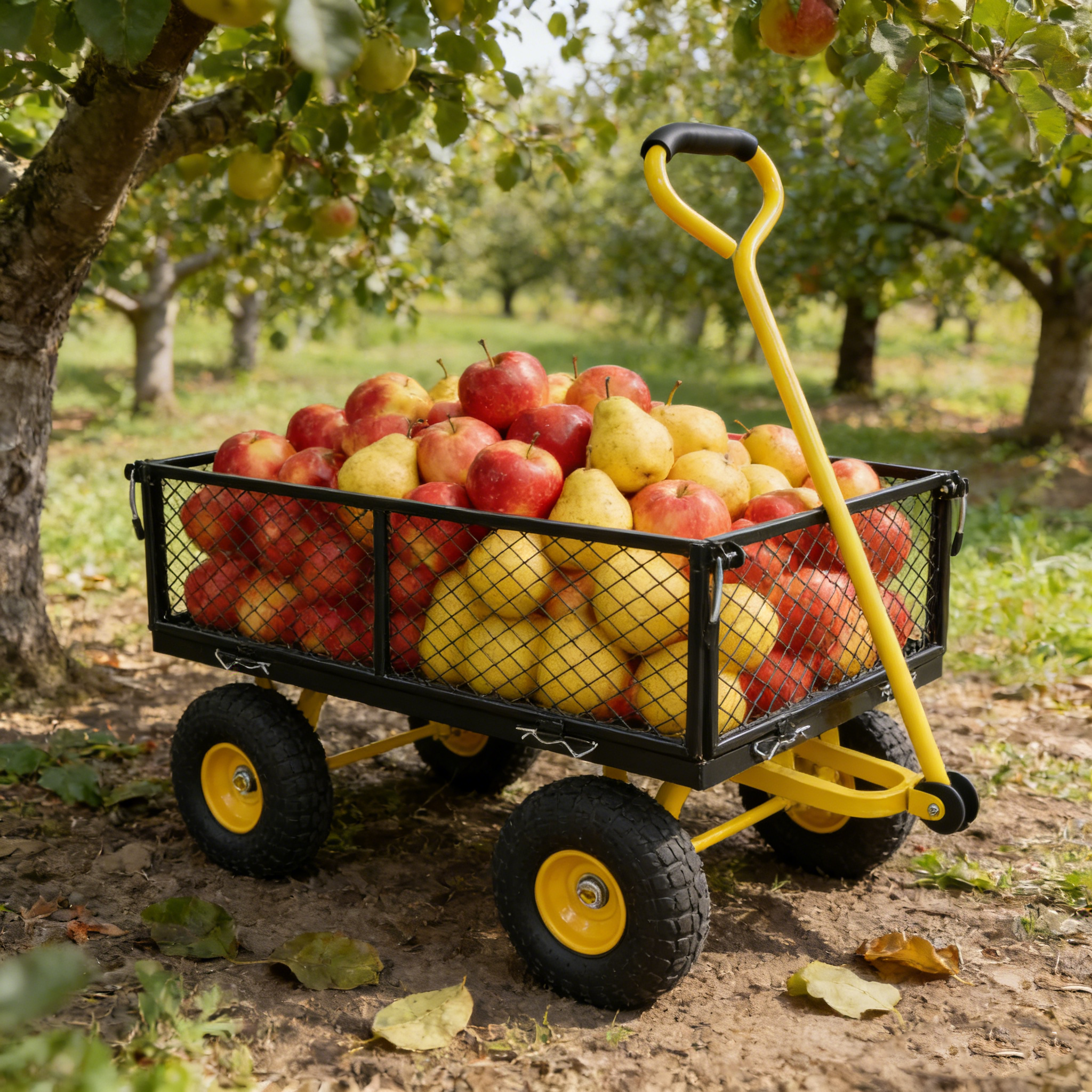 • Inflatable tires: Equipped with powerful inflatable tires, the garden dump cart can easily glide over lawns and uneven terrain, ensuring you can reach every corner of your garden.