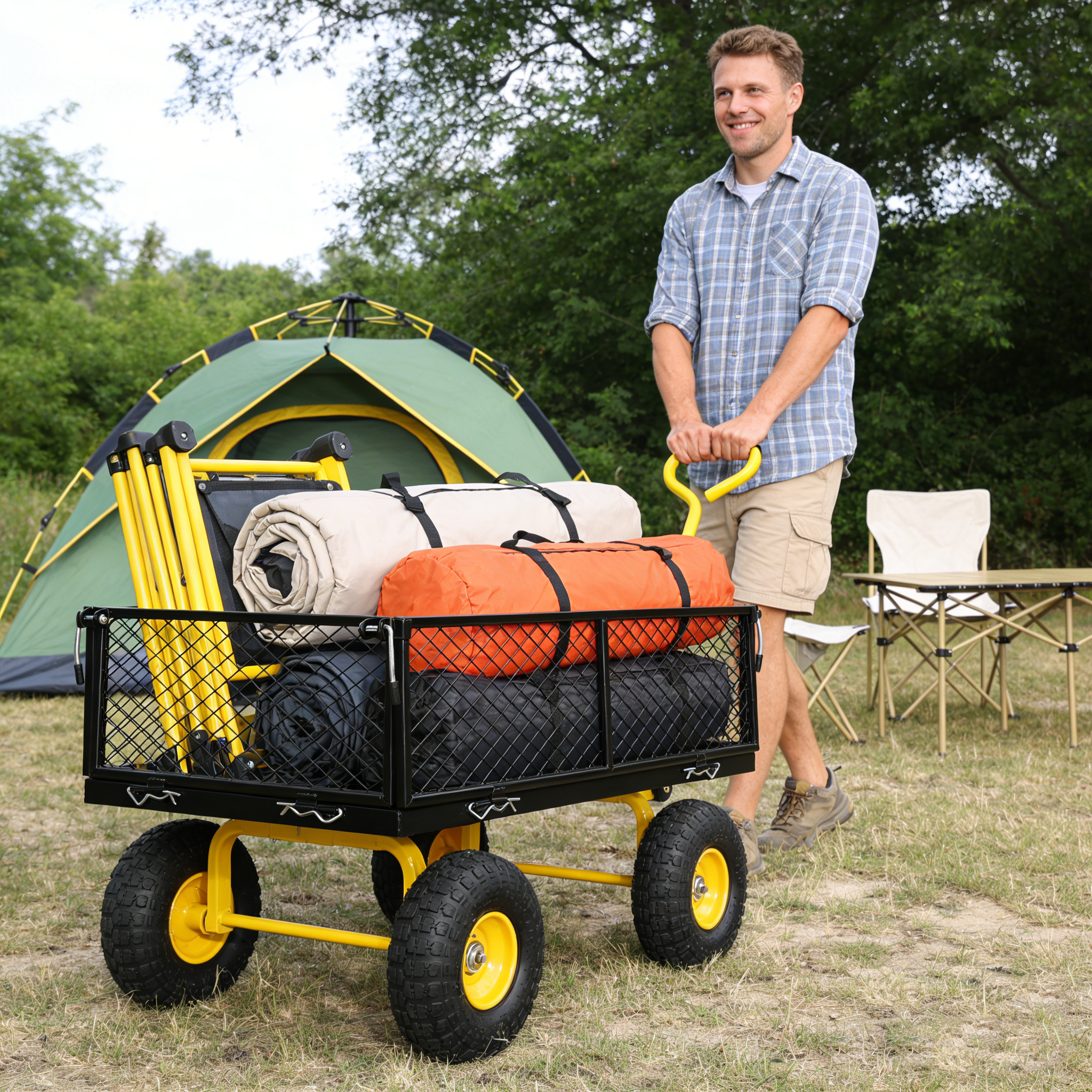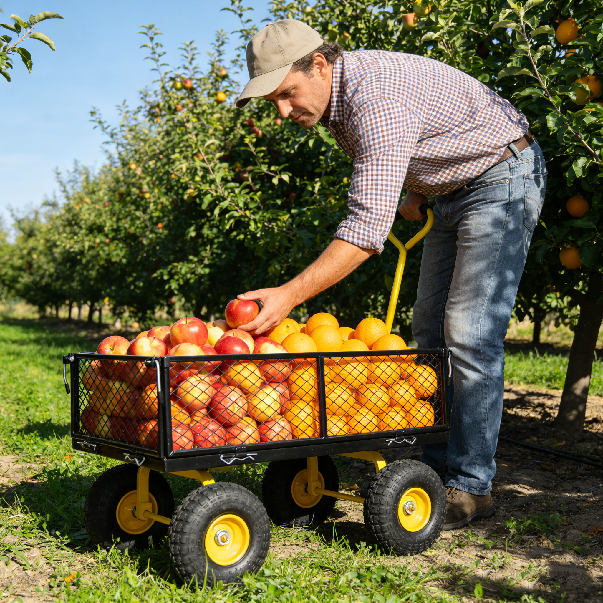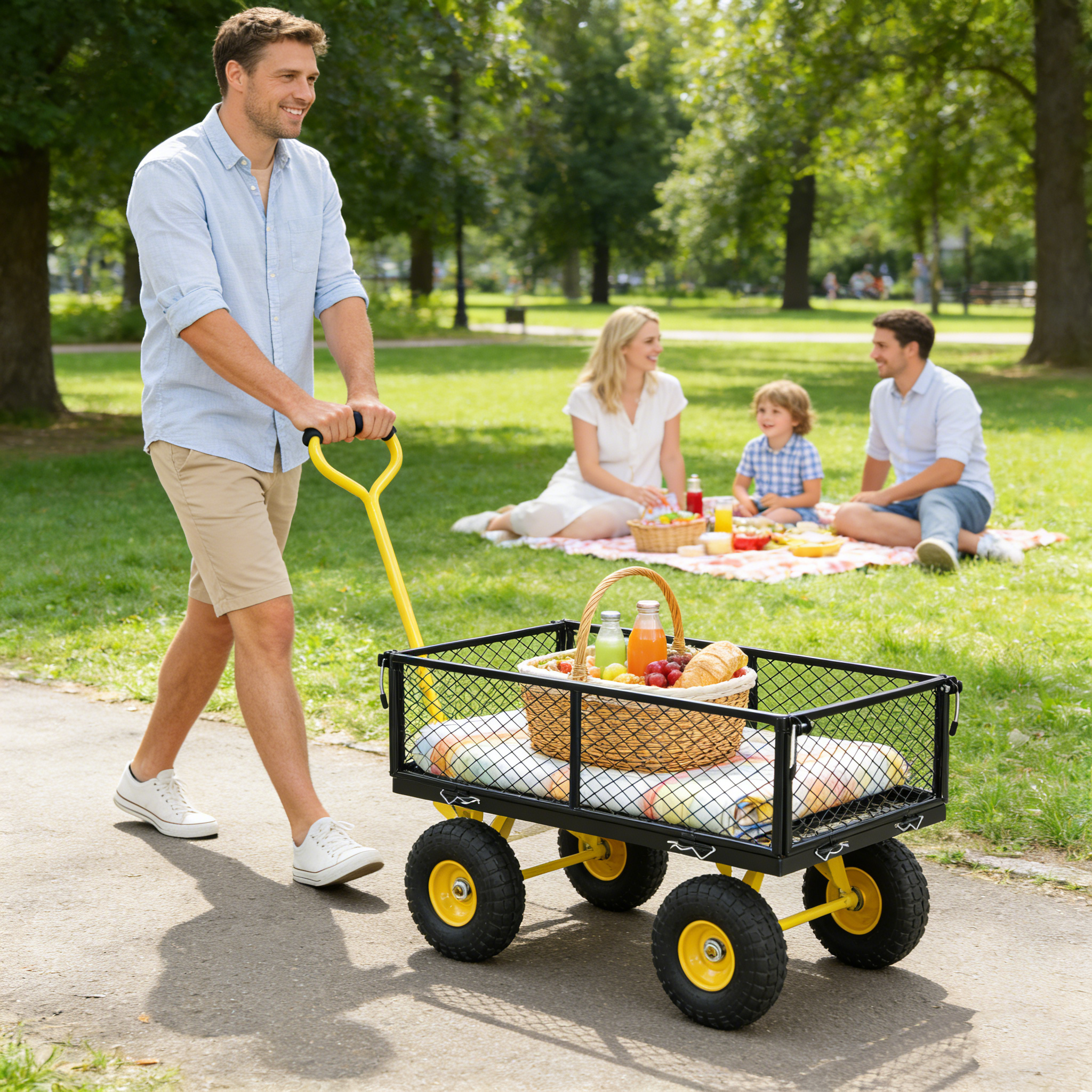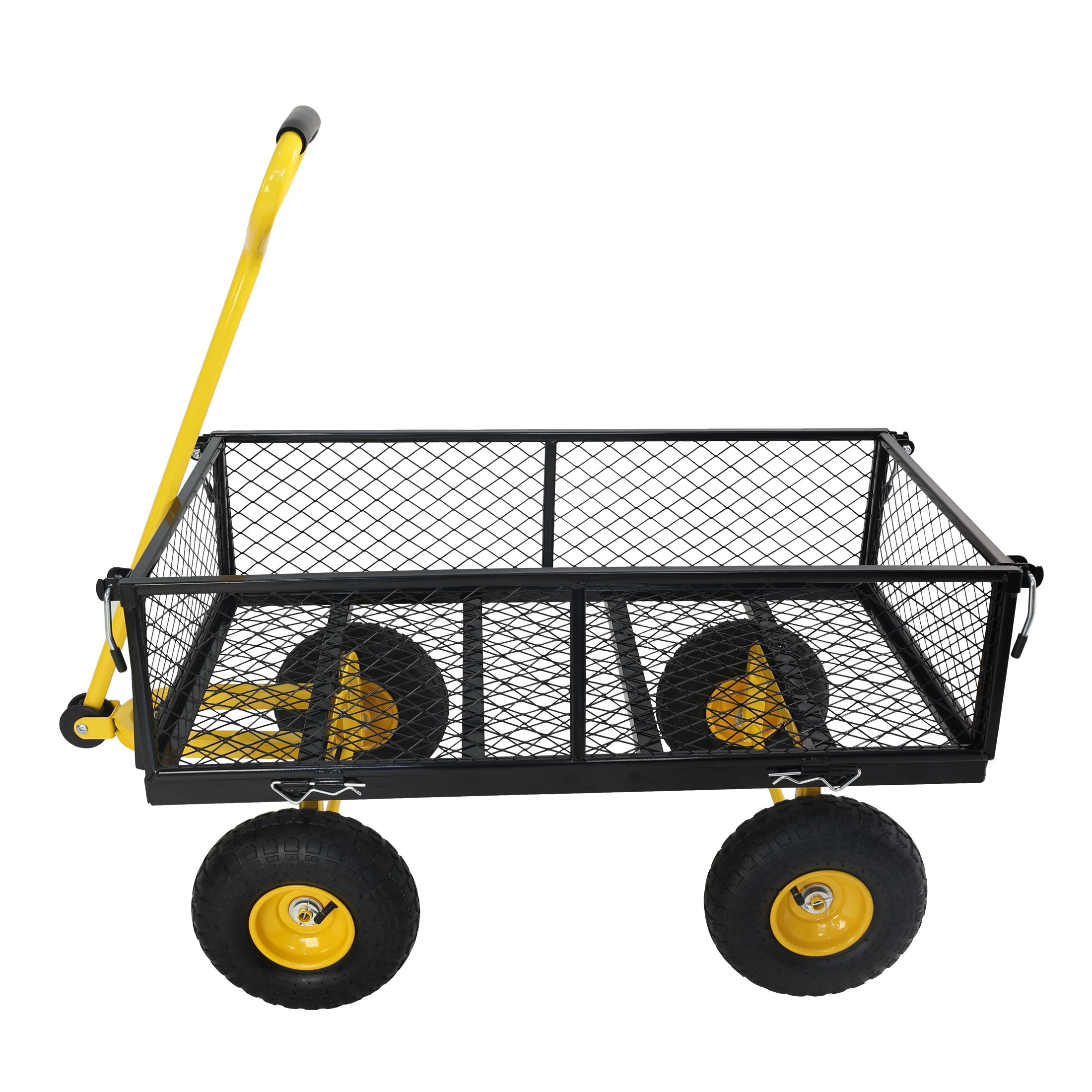 • Inflatable tires: Equipped with powerful inflatable tires, the garden dump cart can easily glide over lawns and uneven terrain, ensuring you can reach every corner of your garden.