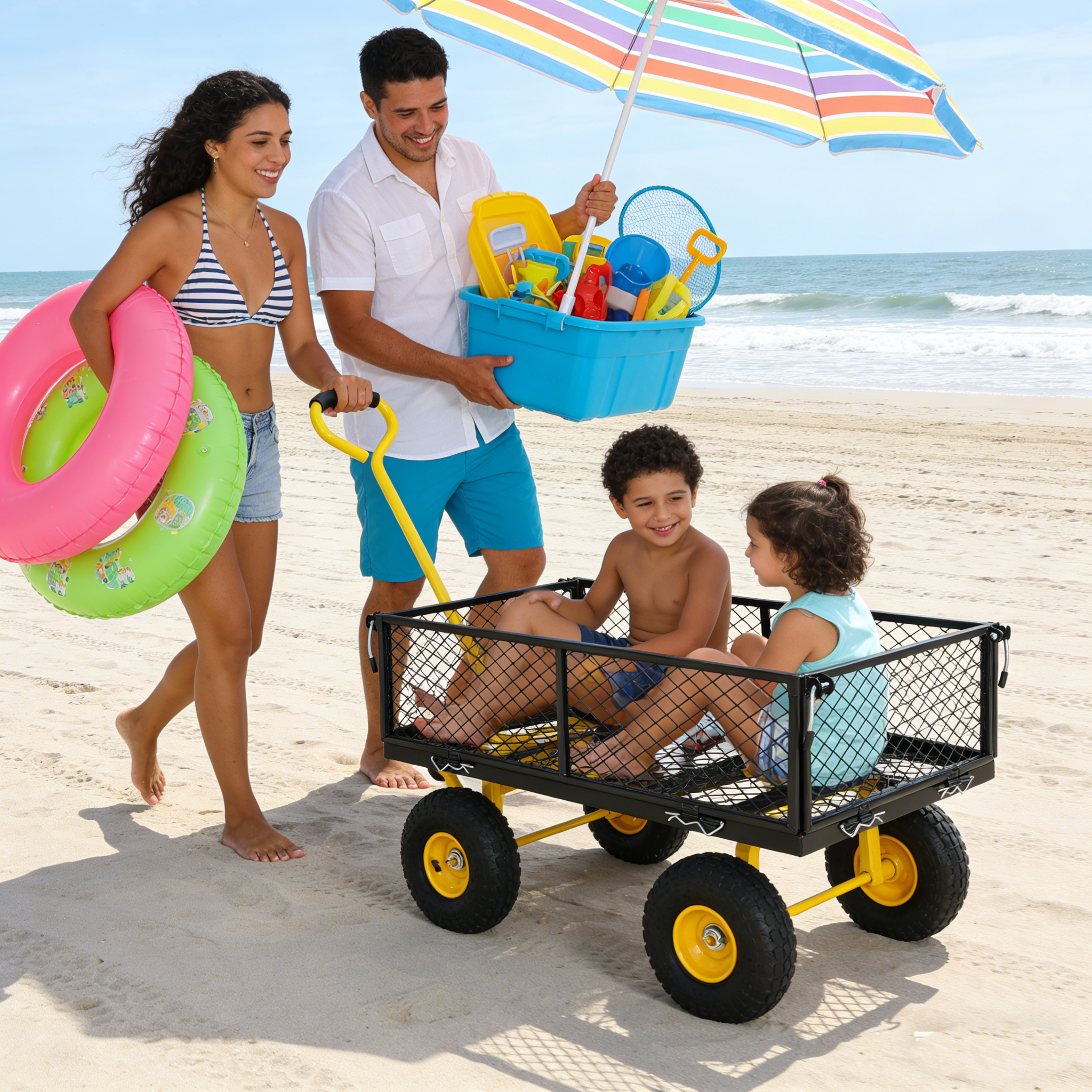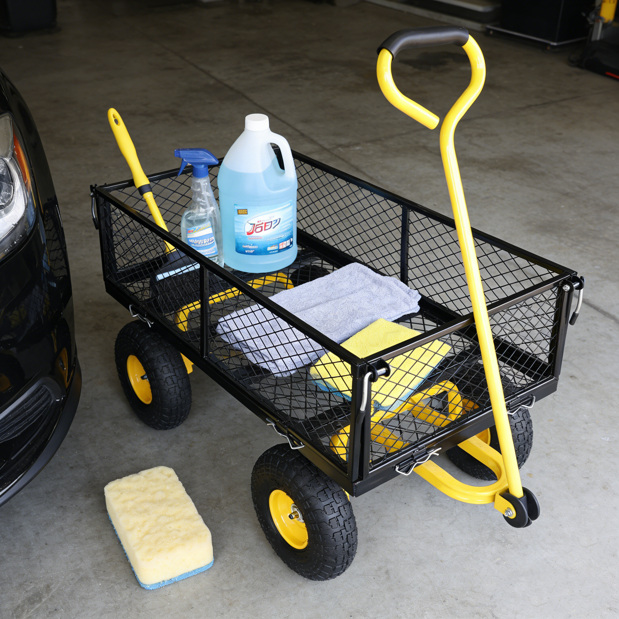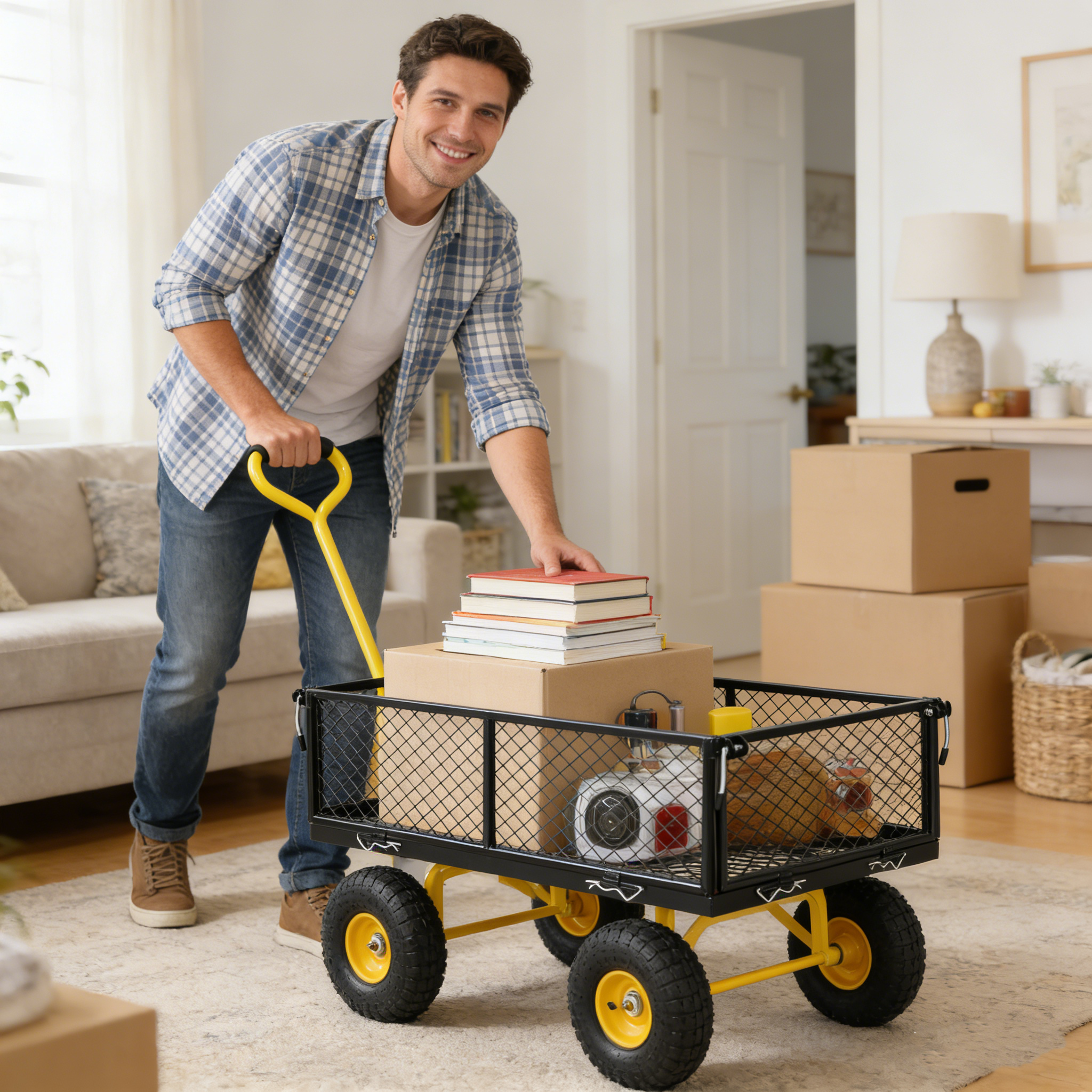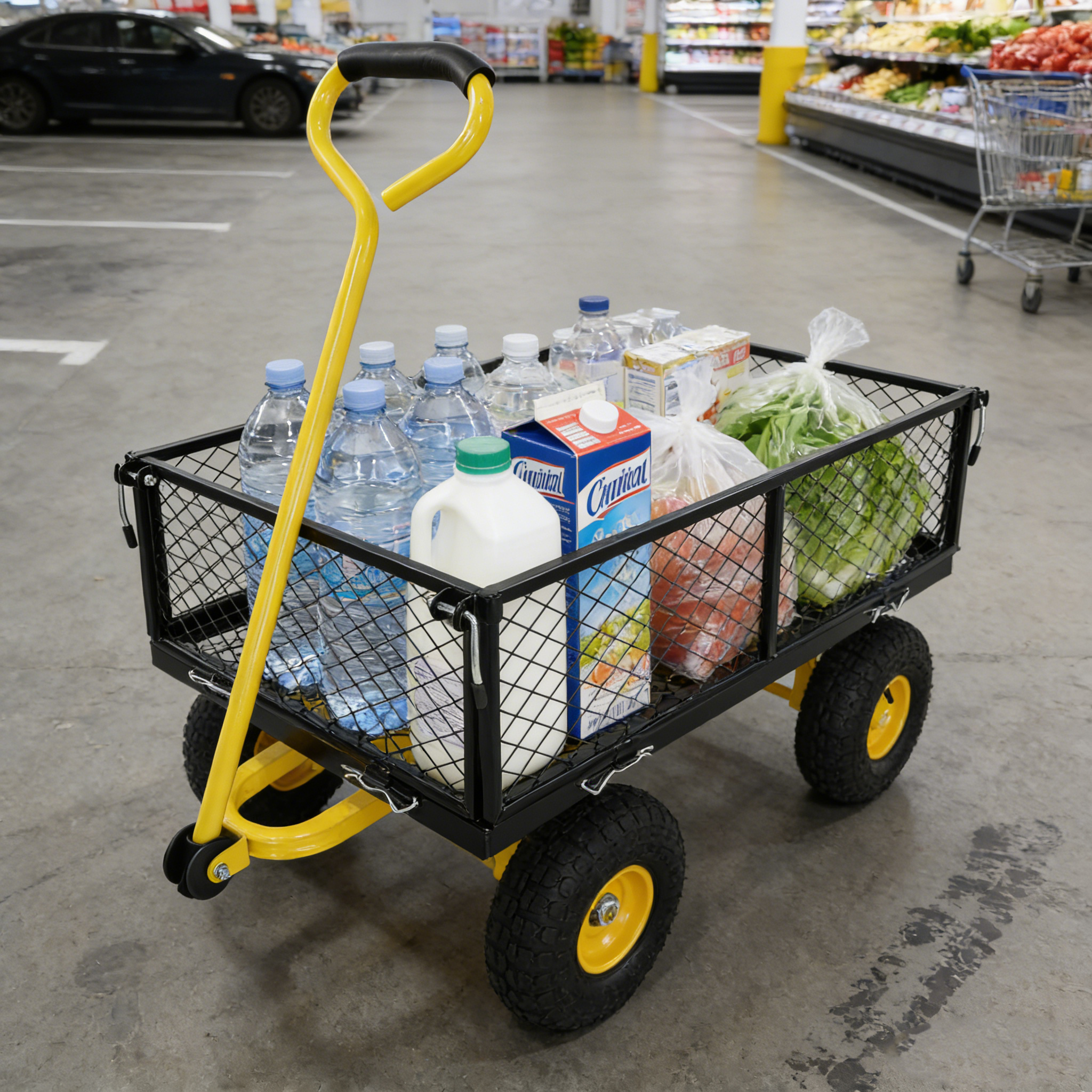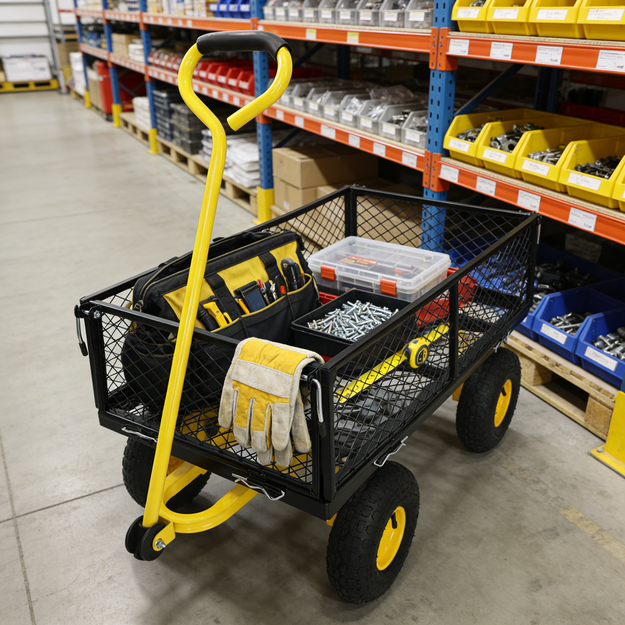 • Inflatable tires: Equipped with powerful inflatable tires, the garden dump cart can easily glide over lawns and uneven terrain, ensuring you can reach every corner of your garden.
