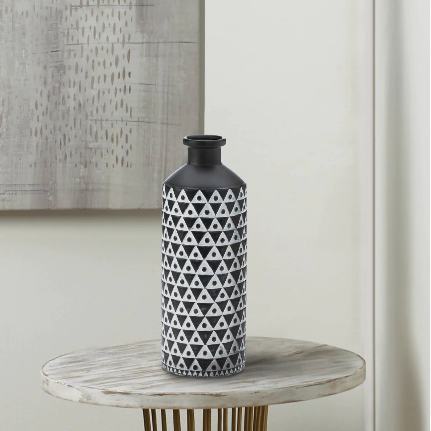 With its geometric pattern and traditional shape, the Mazara Vase infuses old world charm with modern design. ||White triangle pattern. Matte black base.